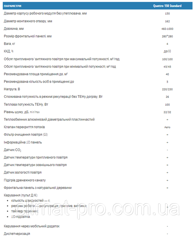 Рекуператор Quattro 150 Standard від Climtec - опис: