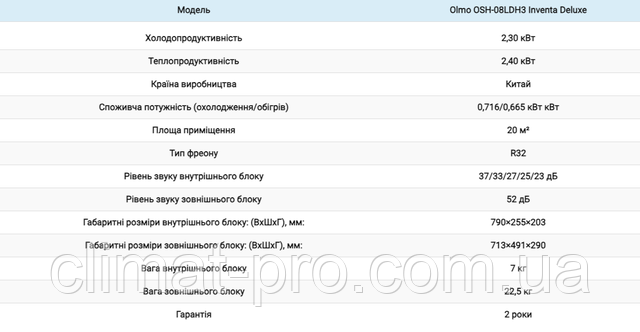 Технічні характеристики кондиціонера OLMO OSH-08LDH3 Inventa Deluxe
